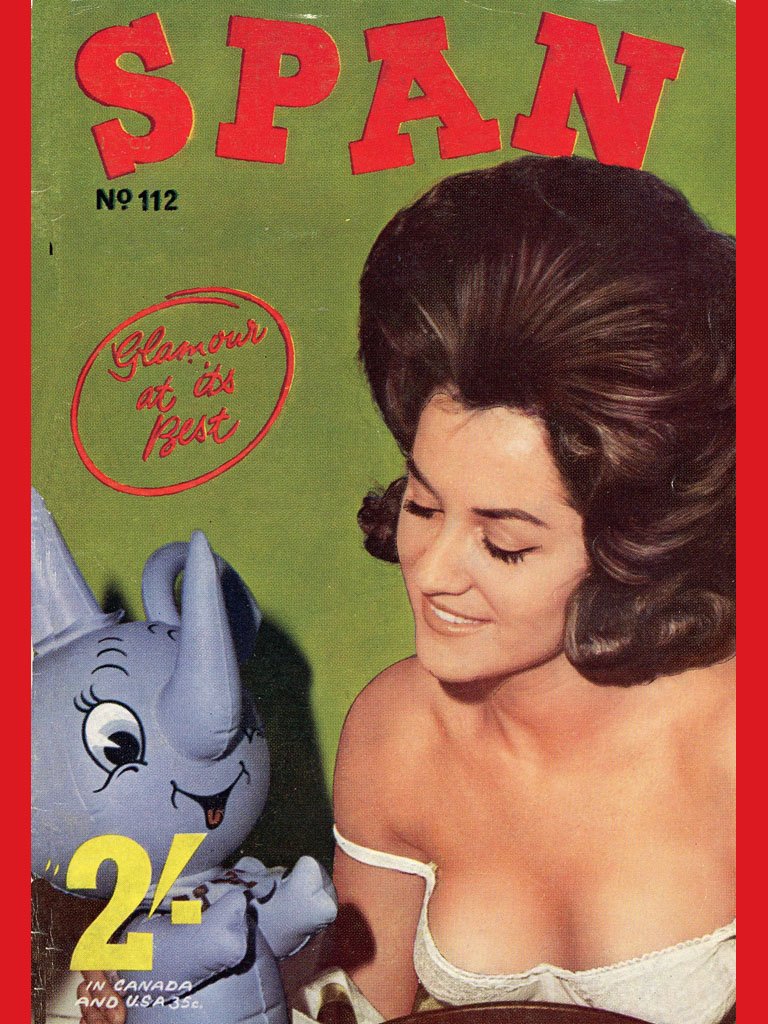 It was a feature of early 1960s Spick and Span that some anthropomorphic toy, one or two not so little, appeared with the smitten model. They looked as though they were blow-up dolls (not that sort), but I could be wrong. I seem to recall it was the original Scottish photographer, J B Fullerton, who introduced them into a Spick and Span skit. Well they were also adopted by his successor, Mr Shaw, as this cover of Span featuring an adoring Anne Scott reveals. I think the happy little fellow clapping his hooves and looking ecstatic in the company of Anne is some kind of rhino. Funnily enough, the cheeky chappie was dumped in the eight-page spread on Anne inside.